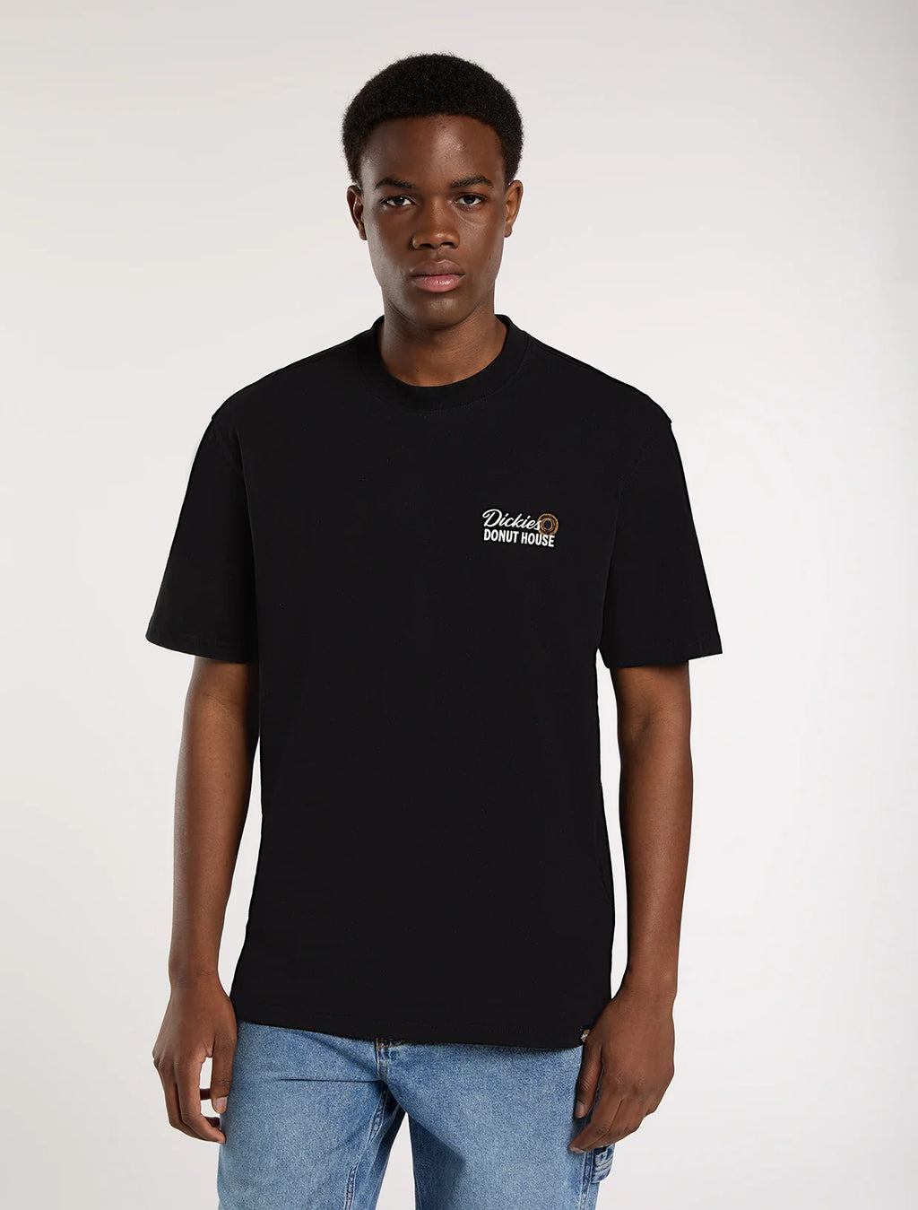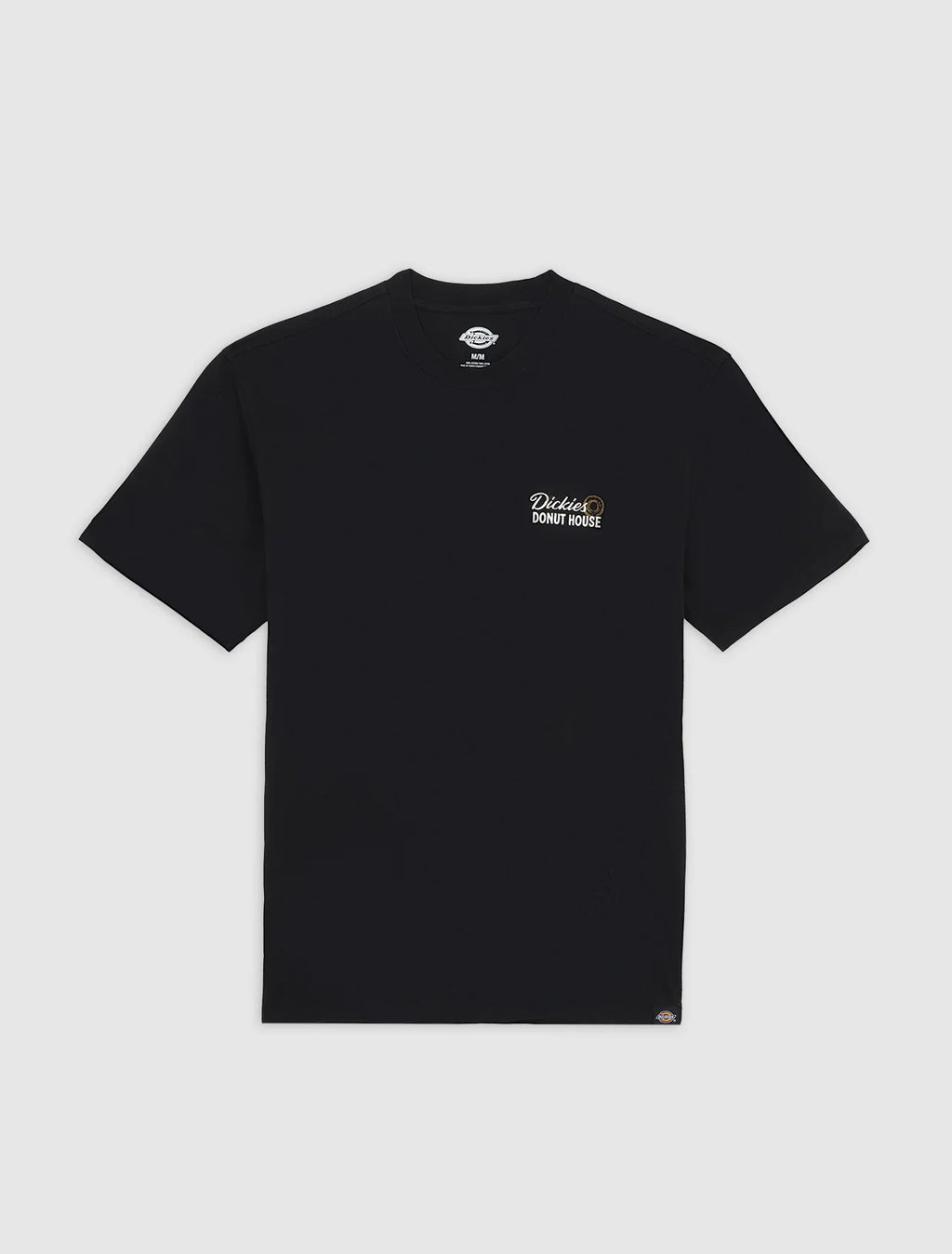 Dickies Donut House Tee hylder klassisk workwear med en retro truck-stop grafik. Denne t-shirt er fremstillet i 100% blød bomuldsjersey og har en afslappet pasform, hvilket sikrer både komfort og holdbarhed. Designet inkluderer et lille "Dickies Donut House"-print på venstre bryst og en stor, farverig grafik på ryggen, hvilket giver et autentisk og tidløst udtryk.