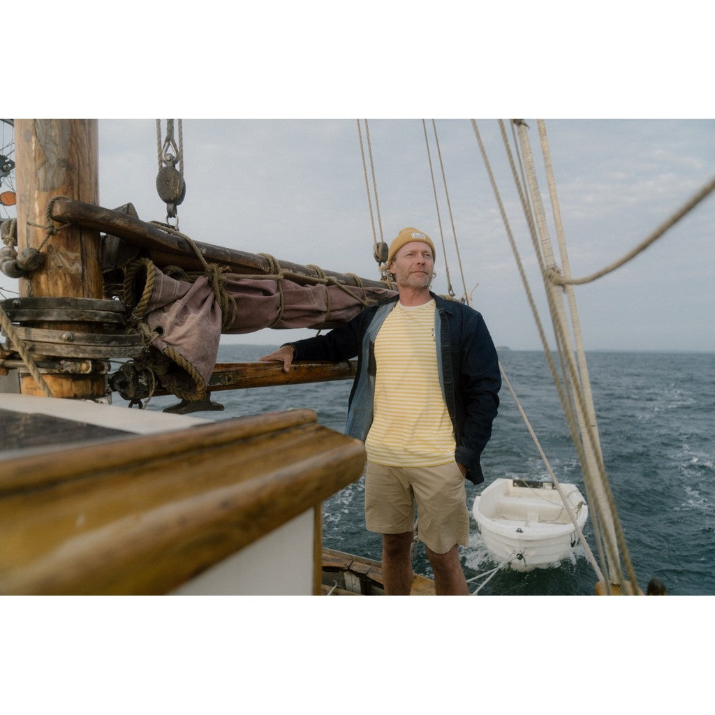 Casual denimjakke/overshirt lavet af en blanding af materialer, primært økologisk bomuld, SEAQUAL® plastfiber fra genvundet havplast, lyocell, genanvendt bomuld og en smule elastan – en kombination, der gør stoffet både bæredygtigt, åndbart og med lidt stretch for komfort. Jakken har klassisk krave, knaplukning og funktionelle lommer, hvilket gør den velegnet som let jakke til hverdagsbrug og layering.